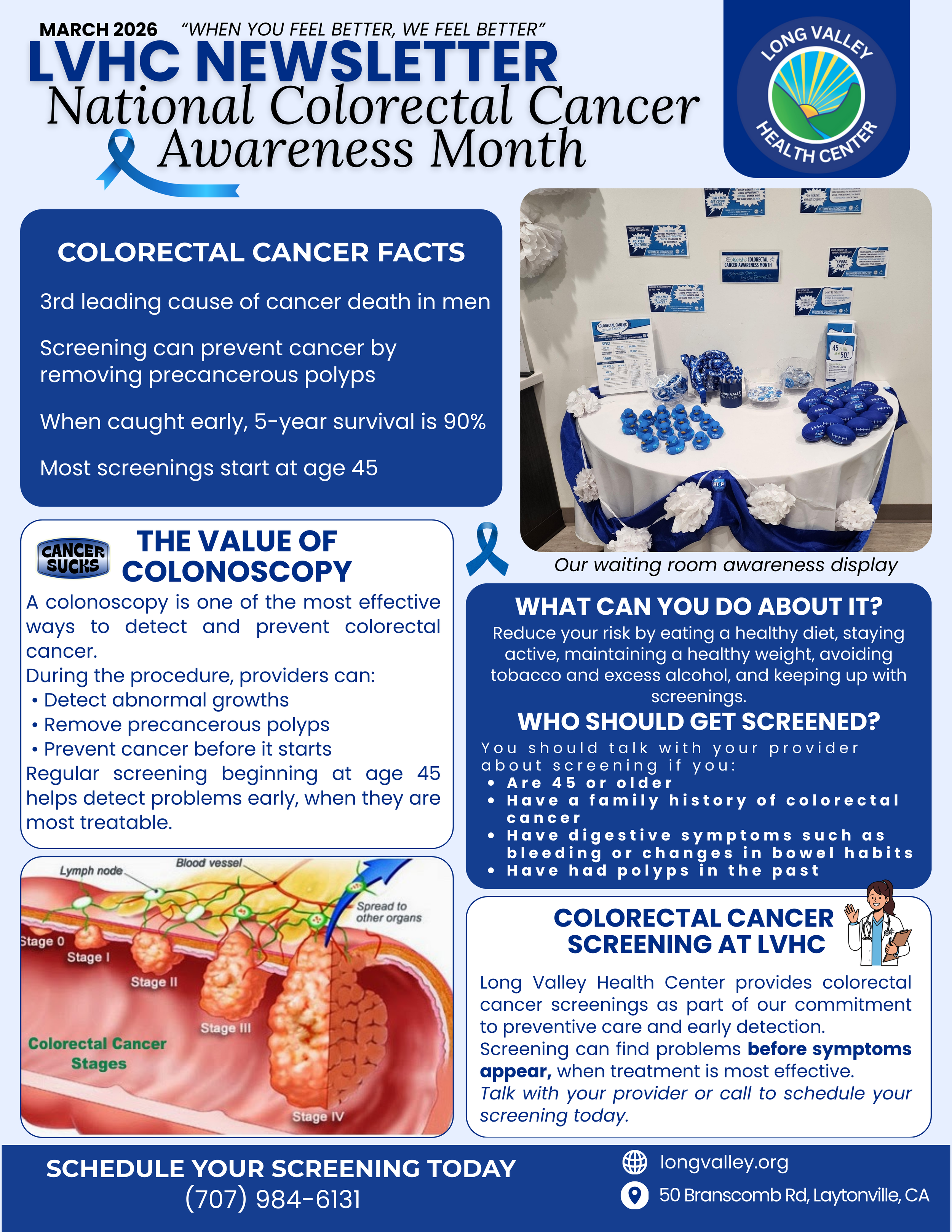 March is National Colorectal Cancer Awareness Month. Screening can detect and prevent colorectal cancer by removing precancerous polyps. Most screenings begin at age 45, and when caught early, the 5-year survival rate is about 90%.